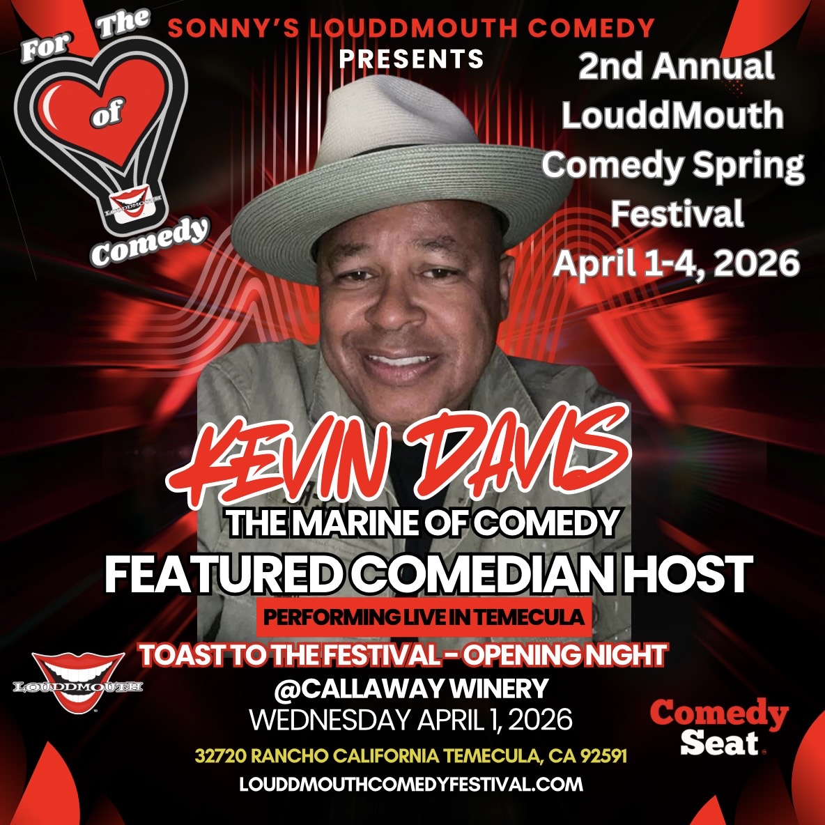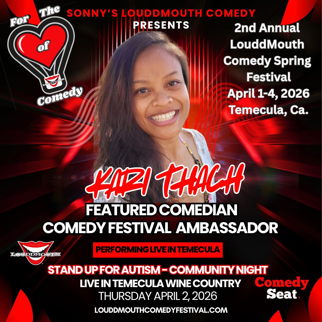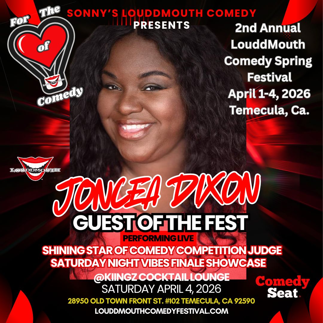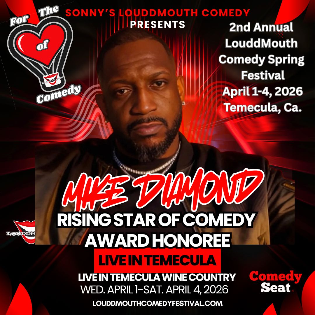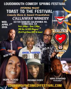 The Toast of the Festival opening night- is the LouddMouth Comedy Festival Kickoff on Wednesday April 1st, 2026, which will also be an honoree award recognition to celebrate & honor distinctive Comedic Trailblazers of the festival. Invited guest, VIP & Ticket information will be provided soon on the website for purchase as well as table reservations. Special Guest Comedian Performances will compliment the Wednesday opening event festivities, vendor market of local businesses, network with our festival sponsors while enjoying Featured Comedians to be announced at Callaway Vineyards & Winery 32720 Rancho California Rd. Temecula.