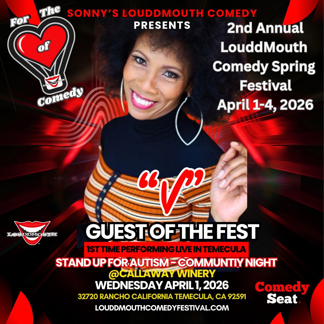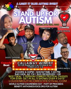 Get Ready for the "Standup For Autism" LouddMouth Comedy Festival Fundraiser Show on April 2nd, 2026 on World Autism Awareness Day. Come out for a night of pure laughter and join us as we "Light it Blue" in support of LouddMouth Comedy's community partnership with an amazing local Autism organization- Anthonie's Voice. Come out and enjoy an hilarious lineup of comedians, local small business vendors, nonprofit Autism and community organizations as we continue the comedy festival for Day 2 at Callaway Winery in the heart of wine country. LouddMouth Comedy Spring 2026 Festival's "Distinguished Guest of the Fest TBA" Part of the Proceeds of this Show will Benefit Non-Profit Organization Anthonie's Voice of Temecula Valley. Doors open at 6:30pm showtime start 7:30pm.